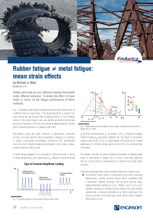 The article focuses on the difference in fatigue behaviour between rubber and metal materials. While metal fatigue is often described by a simple rule: increasing mean strain is detrimental to fatigue life, rubber fatigue is more complex and depends on the material's ability to strain crystallize.