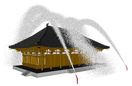 This article presents simulation examples for three types of firefighting equipment for cultural heritage buildings using Particleworks, a CFD software based on the Moving Particle Simulation (MPS) method: a water discharge gun, a drencher, and a firefighting drone. Such firefighting equipment is generally verified by means of installation standards and on-site water discharge tests, however, field tests that include all realistic fire conditions are impractical due to the cost and the physical risk to valuable buildings.